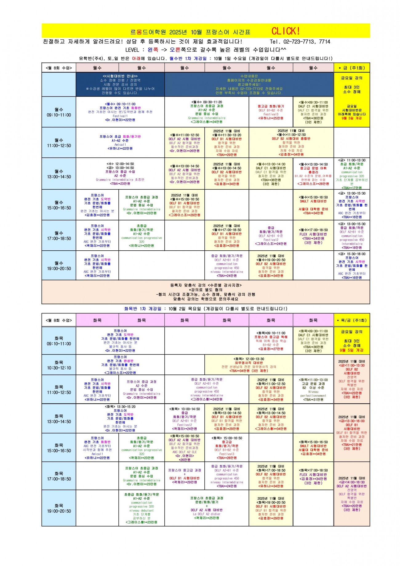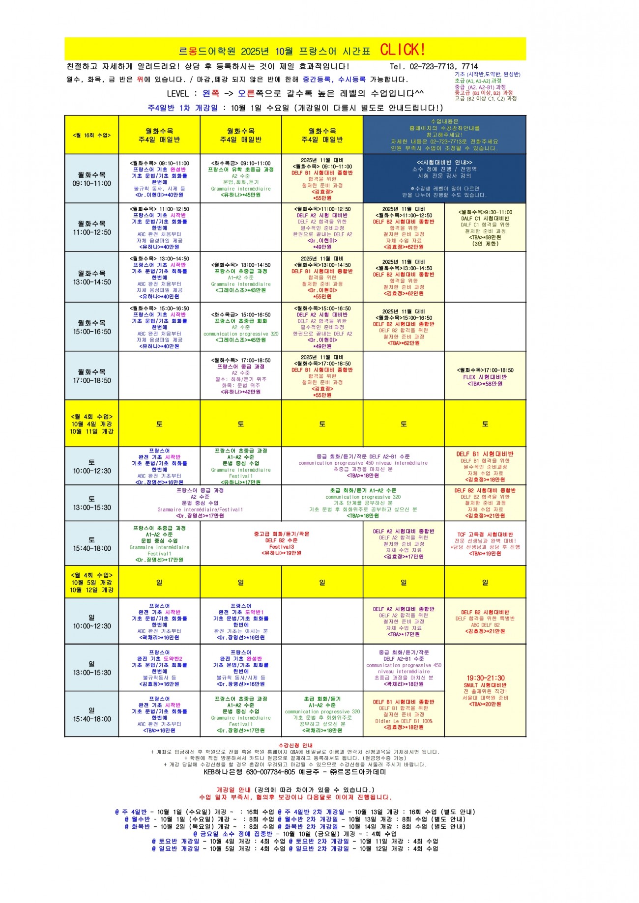[대면]+ 2025년 10월 프랑스어 시간표 (학원내 대면 수업) ++ 르몽드어학원 2025년 10월 프랑스어 시간표 +