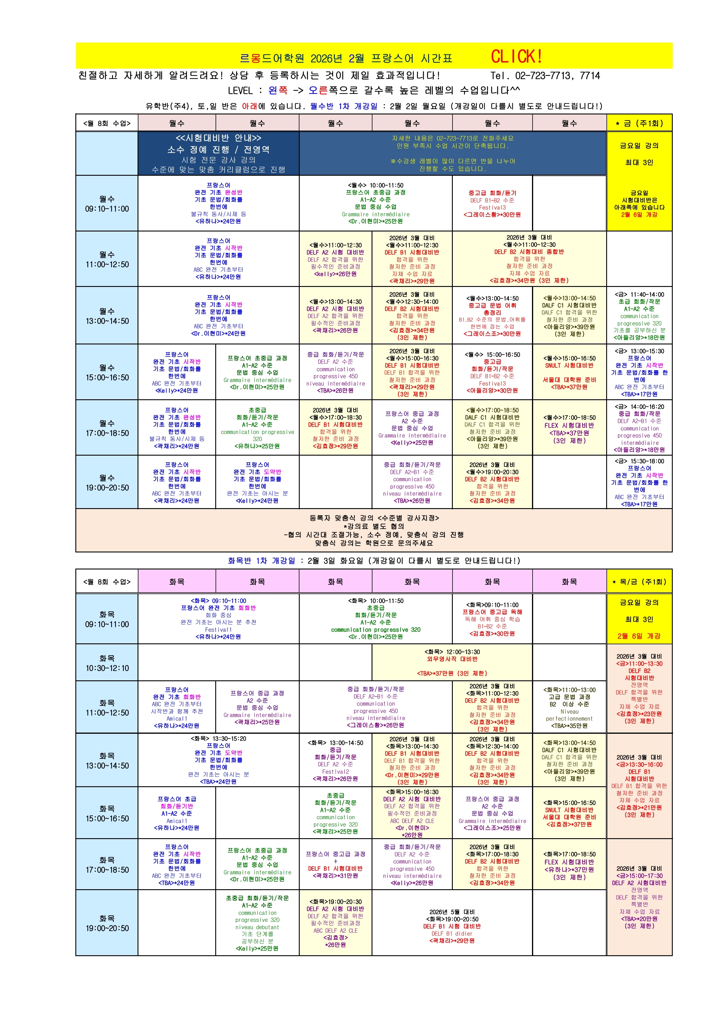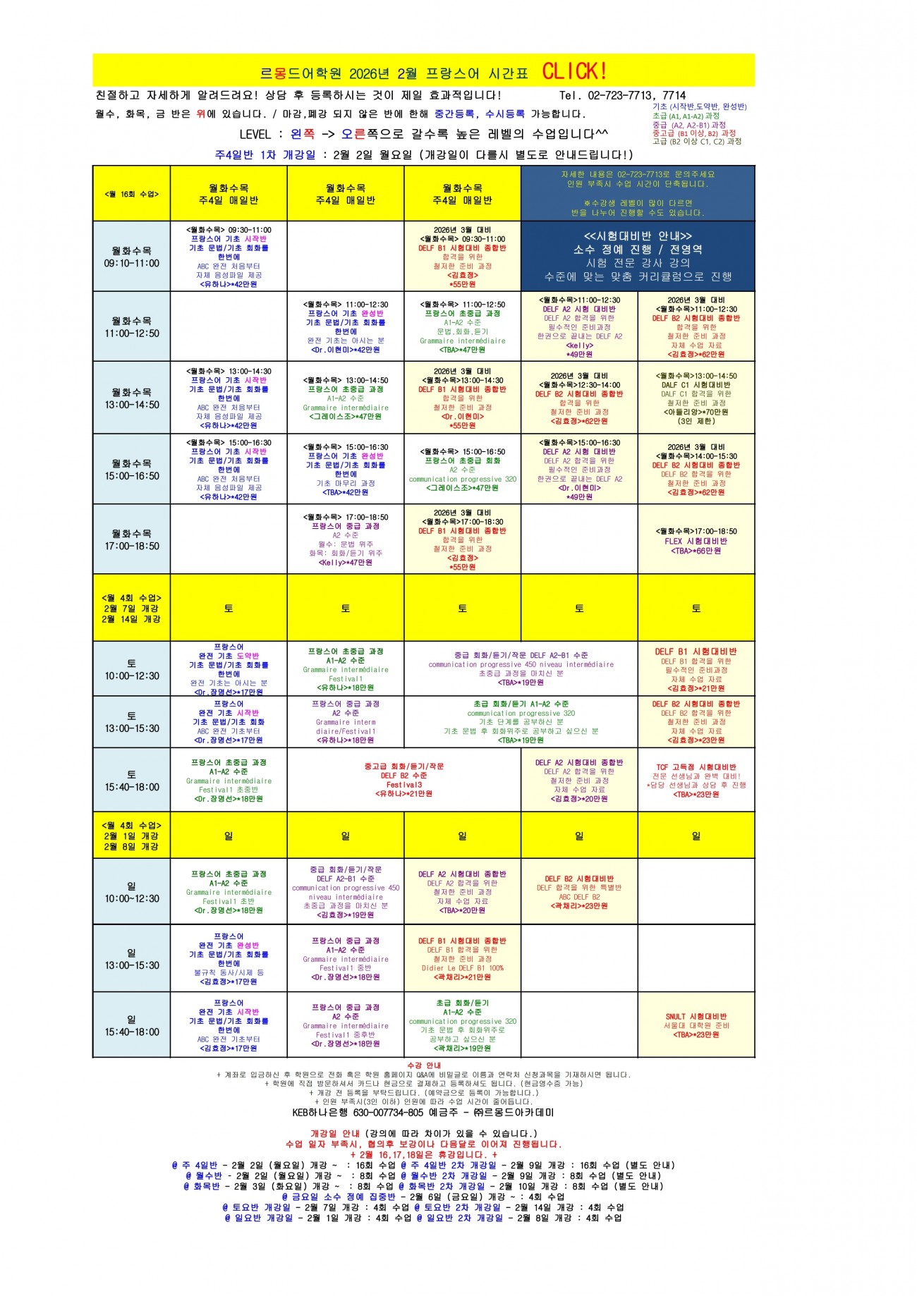 [대면]+ 방학특강 2026년 2월 프랑스어 시간표 (학원내 대면 수업) ++ 르몽드어학원 2026년 2월 프랑스어 시간표 +